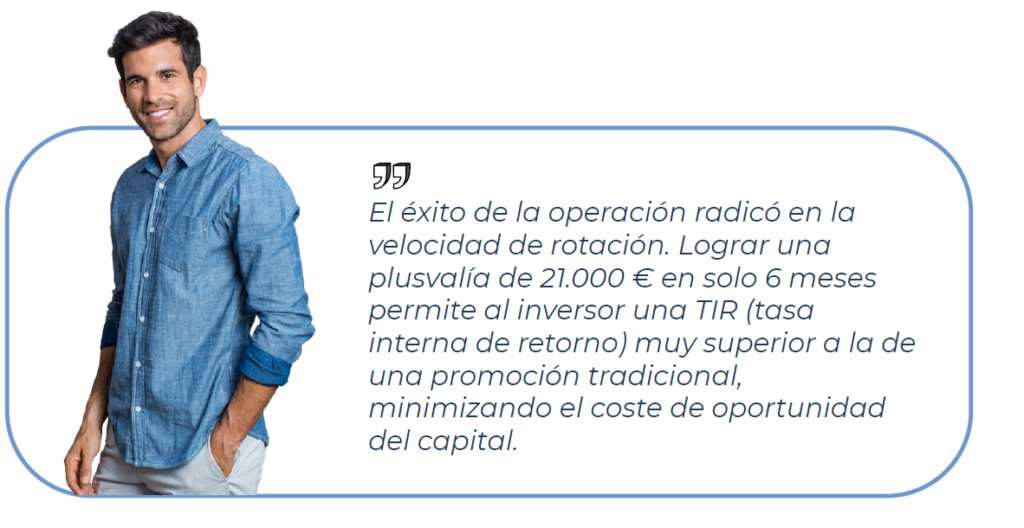 El inmueble se liquidó por un importe de 115.000 €, lo que supuso una venta un 5 % por encima de la previsión inicial del plan de negocio. La estrategia de salida se ejecutó mediante la venta directa a un comprador final, atraído por un producto con garantía de obra nueva y un consumo energético reducido, factores que lo posicionaron como la opción más competitiva frente a la oferta de segunda mano en el centro de Castellón.